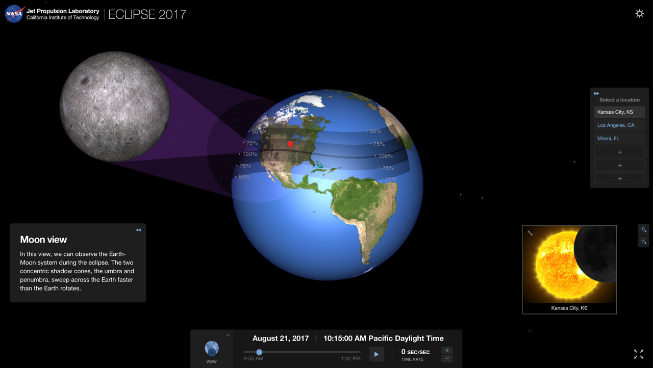 View an Eclipse from multiple perspectives over time with NASA's Eclipse 2017. Monitor sea level height, atmospheric carbon dioxide concentration, Antarctic ozone and other vital signs with Earth Now. Explore our galaxy with Eyes on Exoplanets.